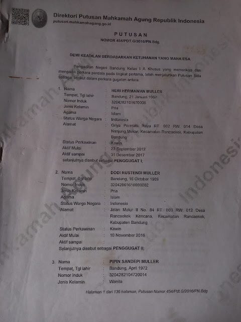 - Kasus pidana: Berbalik dari gugatan perdata, Muller bersaudara (Heri Hermawan Muller dan Dodi Rustandi Muller) justru ditetapkan sebagai tersangka kasus pemalsuan surat dan dokumen.